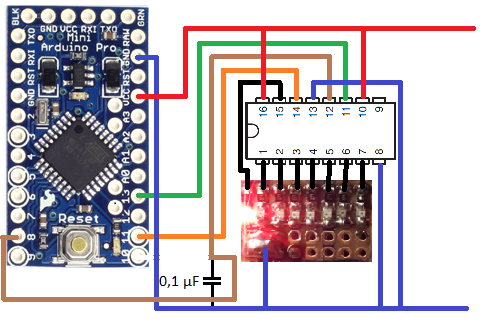 Ardruino shift registers (74HC595)This guide shows how to get outputs with 74HC595 and a Ardruino pro mini - Here only used as output !! starting with 1 shift register, then 2.. Later you can daisy-chain the shiftregisters to get unlimmit number of outputs ! Depending on the speed you what to change the outputs with. The shiftregister is